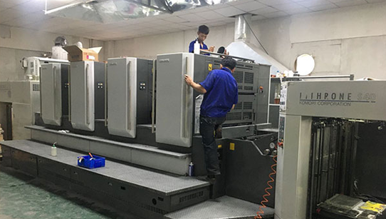 擁有2臺日本小森全開四色印刷機,UV上光過油機,全自動燙金模切機,瓦楞機、覆膜機、絲網機、全自動高速糊盒機等印刷后道設備。